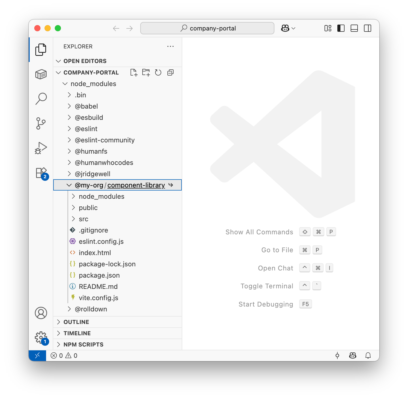 and check that the symlink is valid. This will let you know whether the linking process succeeded or not. Sometimes I'll find that this still has the installed package, which is a top culprit for your component library changes not appearing. Symlinks are displayed differently in different editors. I find that Finder (say that faster! 😉) in macOS displays them very clearly like so: